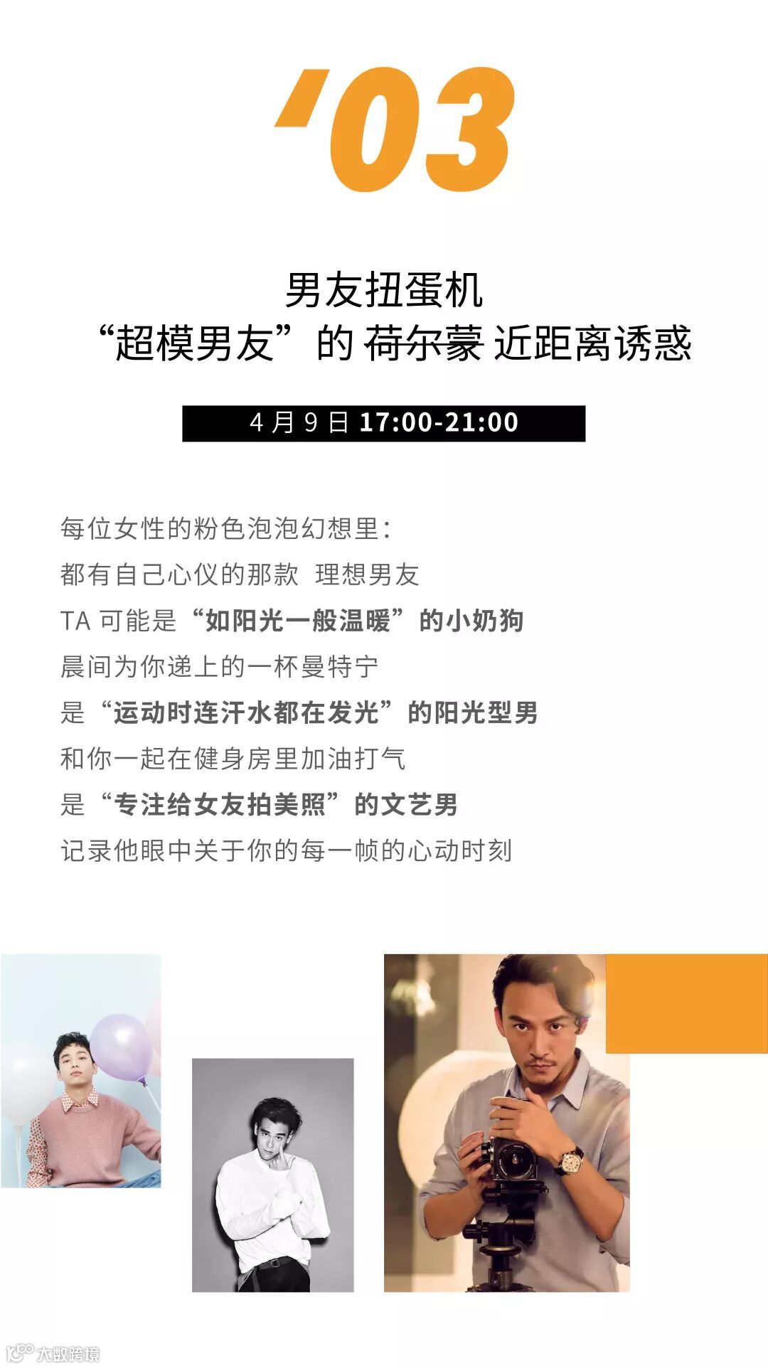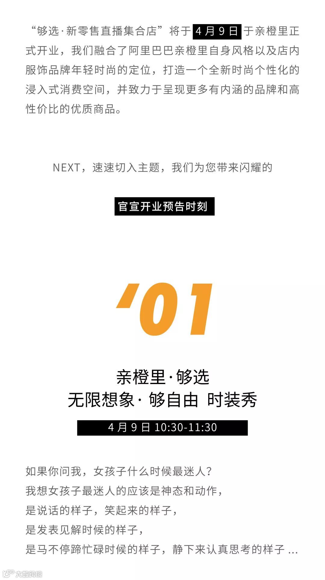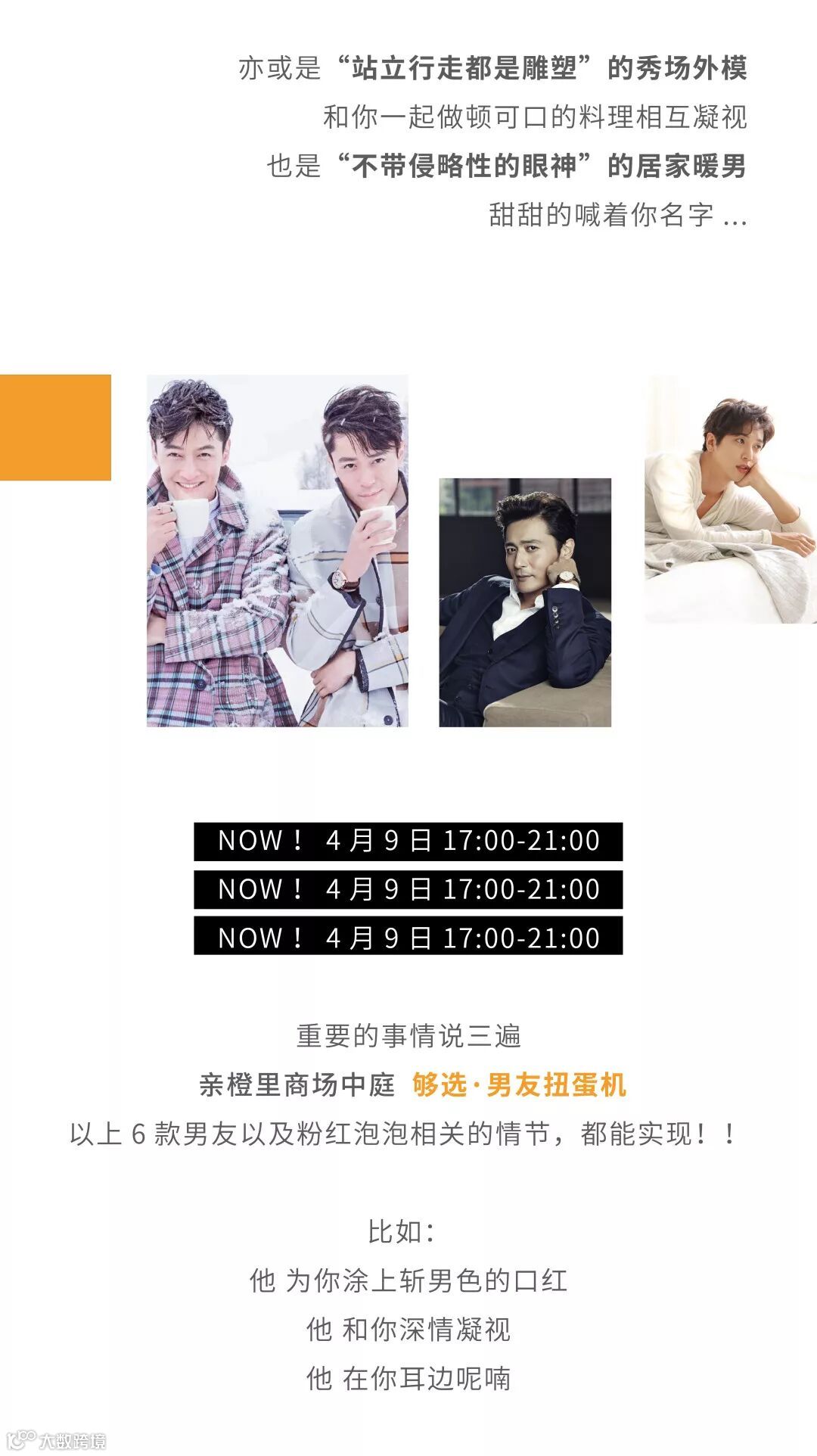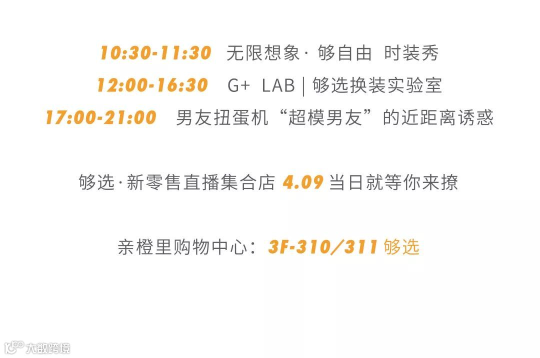10:30-11:30 无限想象· 够自由 时装秀12:00-16:30 G+ LAB | 够选换装实验室17:00-21:00 男友扭蛋机“超模男友”的近距离诱惑够选·新零售直播集合店 4.09当日就等你来撩亲橙里购物中心:3F-310/311够选