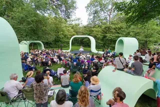 中等幅度的波动给环形内部空间提供出入口,同时满足一些表演需求,装置拉近了表演者与观看者的关系。小幅度波动创造出休闲区域,人们坐在上方聊天、休憩。