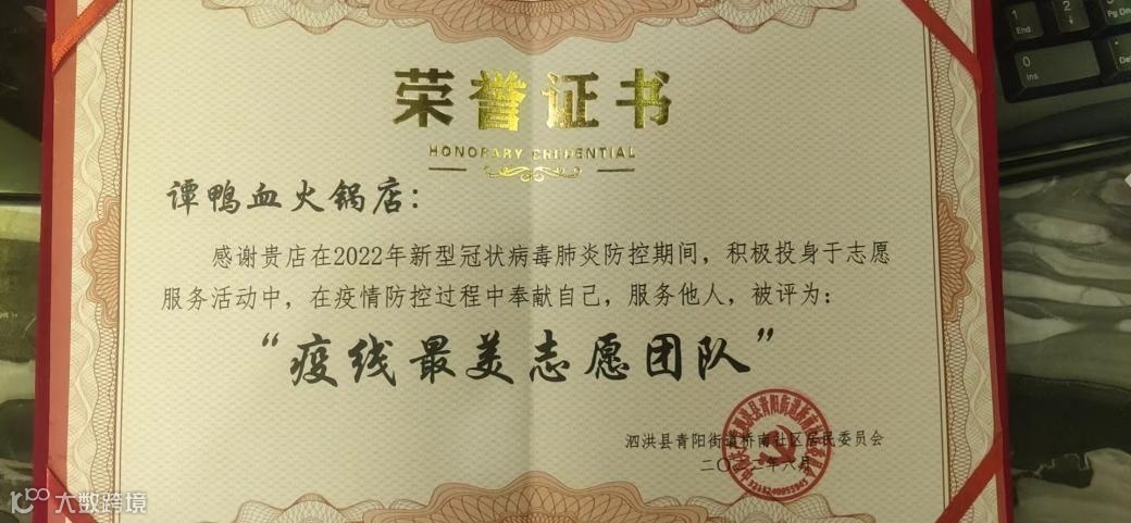 2022年,谭鸭血江苏宿迁泗洪店在疫情防控期间,积极投身于志愿服务活动中,在疫情防控过程中风险自己,服务他人,被评为“疫线最美志愿团队”。
