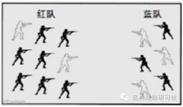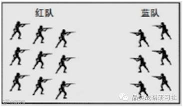 研究交战中的数字法则后,你就会发现为什么通常都是大公司获胜。假设红队有9名士兵,同只有6名士兵的蓝队交战,再假设,平均每3发子弹就有一发能射杀1个士兵。让我们来一起看一下整个战争的推进过程: