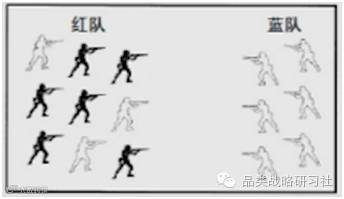 第一轮开火后,红军比蓝军以7:3的人数占有优势,红军由50%的兵力优势变为大于100%。