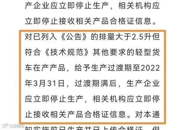 ▎大排量轻卡过渡期至2022年3月底