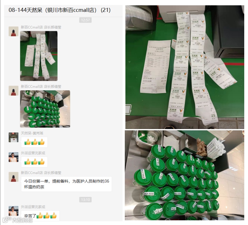 11月30日,天然呆银川新百CCmall店为医护人员准备了36杯热奶茶,用实际行动助力当地抗疫。