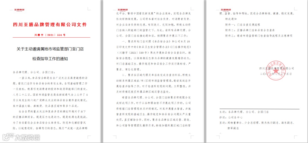 8月25日,为了进一步夯实餐饮企业食品安全主体责任,防范经营风险,实现各品牌良性发展,至膳品牌向各代理、分公司、全国门店颁发了《关于主动邀请属地市场监管部门至门店检查指导工作的通知》。