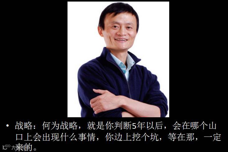 马云对战略的理解很好,虽然非常通俗,但是从某种程度上,他把握住了战略对趋势非常关键的要素。什么是战略?他说你就判断五年以后会在哪个山口上出现什么事,你边上挖一个坑,等在那一定会来的,就是趋势。这就是对未来提前的判断。做得好不如做得早。