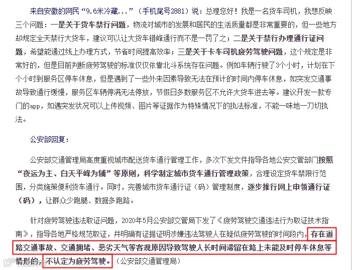 三是关于卡车司机疲劳驾驶问题,这个规定是非常好的,但是目前判断疲劳驾驶的标准仅仅依靠北斗系统存在问题。例如车辆行驶了3个小时,计划在下个小时到服务区停车休息,但是遇到了一些外来因素导致无法在预计的时间内停车休息,如突发交通事故导致通行缓慢,服务区车辆停满无法停放,节假日多数服务区不允许大货车进去等。建议开发一款专门的app,如遇突发状况可以上传视频、图片等证据作为特殊情况下的执法标准,不能一味地一刀切执法。