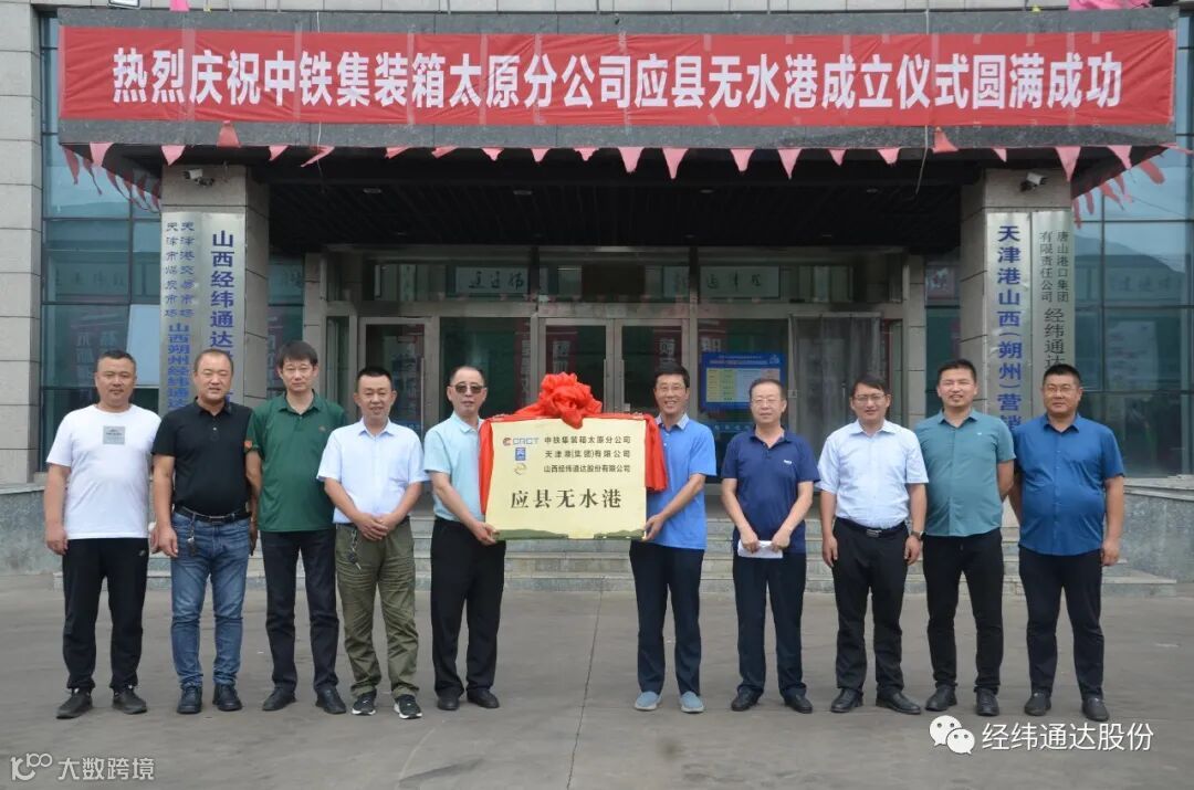 8月18日上午,中铁集装箱太原分公司应县无水港揭牌仪式在山西经纬通达股份有限公司办公楼前举行。公司总经理郝建英与中铁集装箱太原分公司董事长贺欧滨一同为应县无水港揭牌。