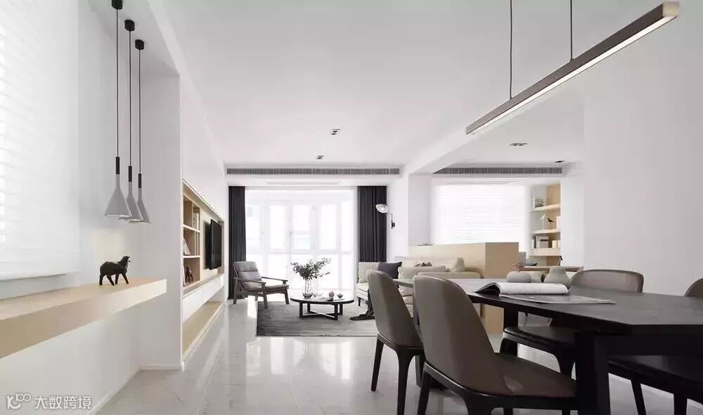 而这些年最 Fashion 的空间布局,莫过于客餐厨一体化。有些甚至将书房、办公区乃至游乐区纳入其中,最大程度地让视线得到延展,增强家庭交流,乍一看仿佛住在了大别墅里。
