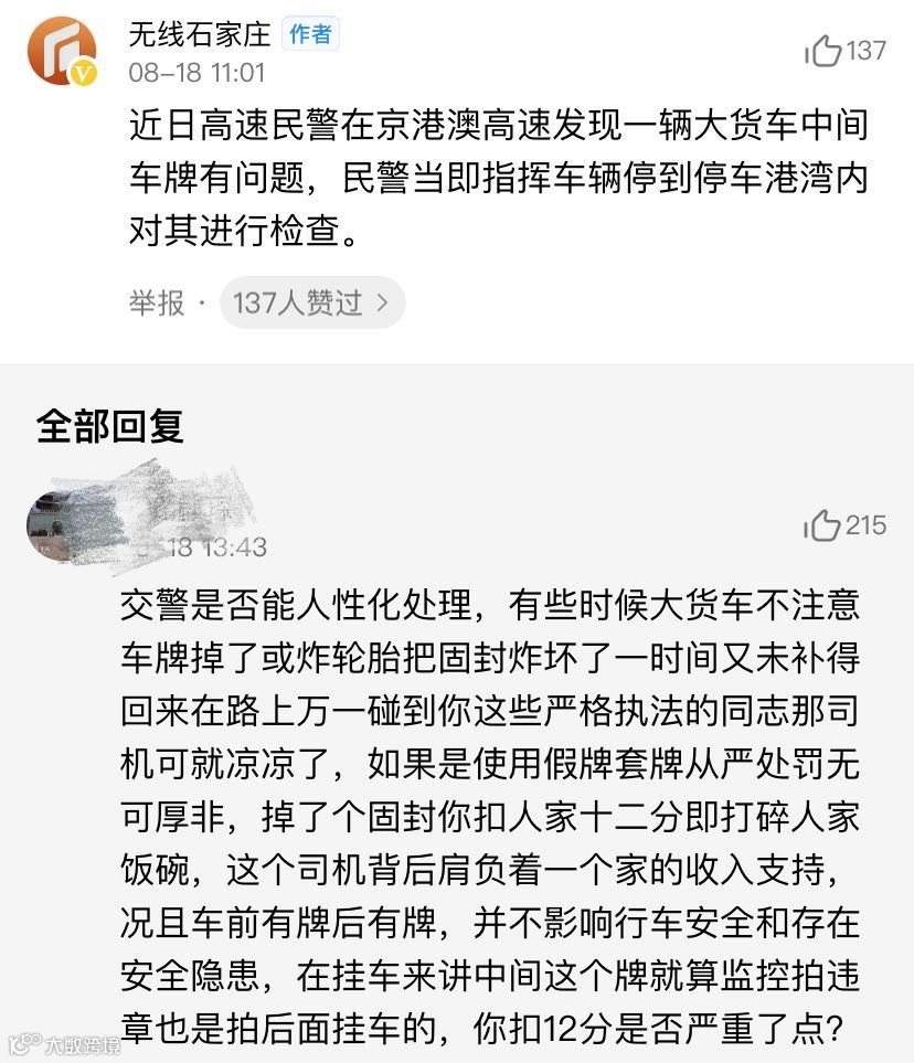 有网友直言:“交警是否能人性化处理,有些时候大货车不注意车牌掉了或者炸轮胎把固封炸坏了一时间又未补好。如果使用假牌套牌从严处罚无可厚非,掉了个固封你扣人家12分就是打碎人家的饭碗,这个司机背后肩负着一个家的收入。”