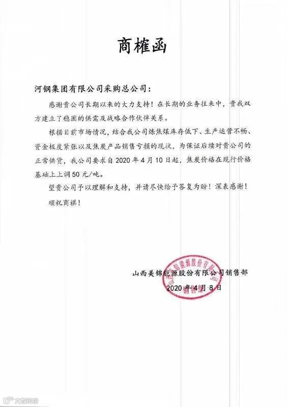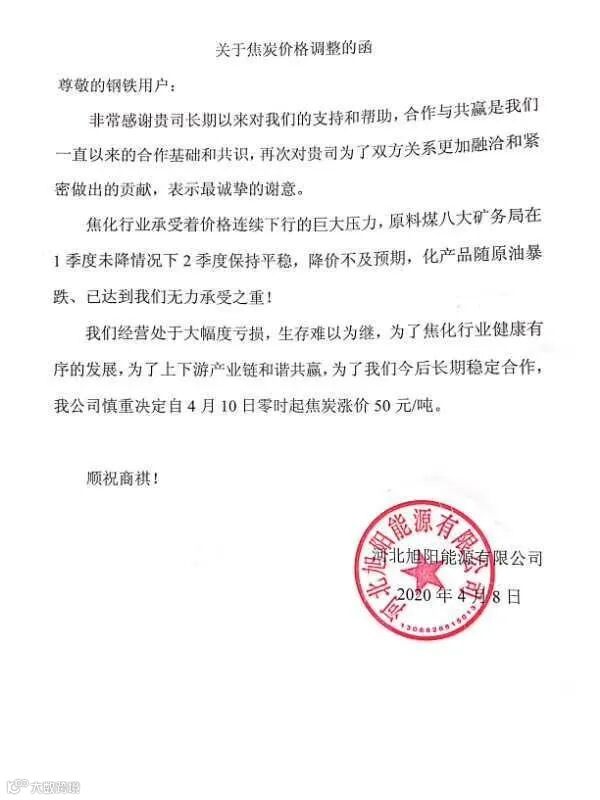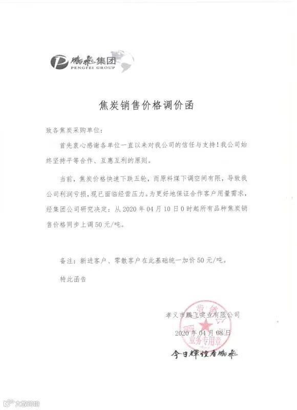 为了保证客户需求得到正常供应, 部分焦企自发限产30%。随着钢铁企业开工率上升,贸易商采购积极性有所好转,2020年4月10日起,山西、河南、河北多家焦企决定价格同步提涨50元/吨。(下附调价函)
