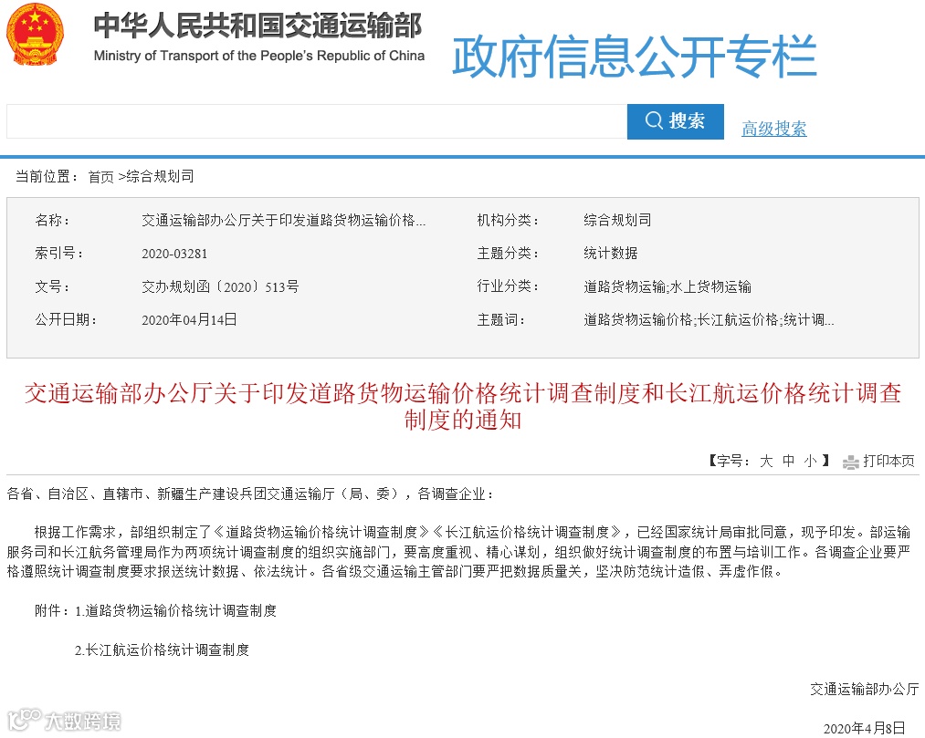 4月14日,交通运输部官网发布文件《交通运输部办公厅关于印发道路货物运输价格统计调查制度和长江航运价格统计调查制度的通知》,旨在在科学、准确地反映道路货物运输价格总水平、变动幅度及其变动趋势,为国家及有关部门进行宏观调控及道路运输市场动态监测提供依据。