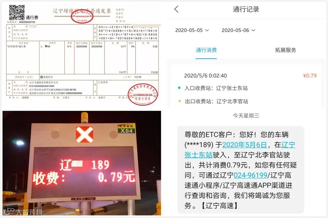 图 | 5月6日0时2分40秒,辽宁省高速公路北李官收费站开具出全国高速公路恢复收费后第一张省内通行费电子发票,通行费金额0.79元,费额显示器显示0.79元,全程计费准确