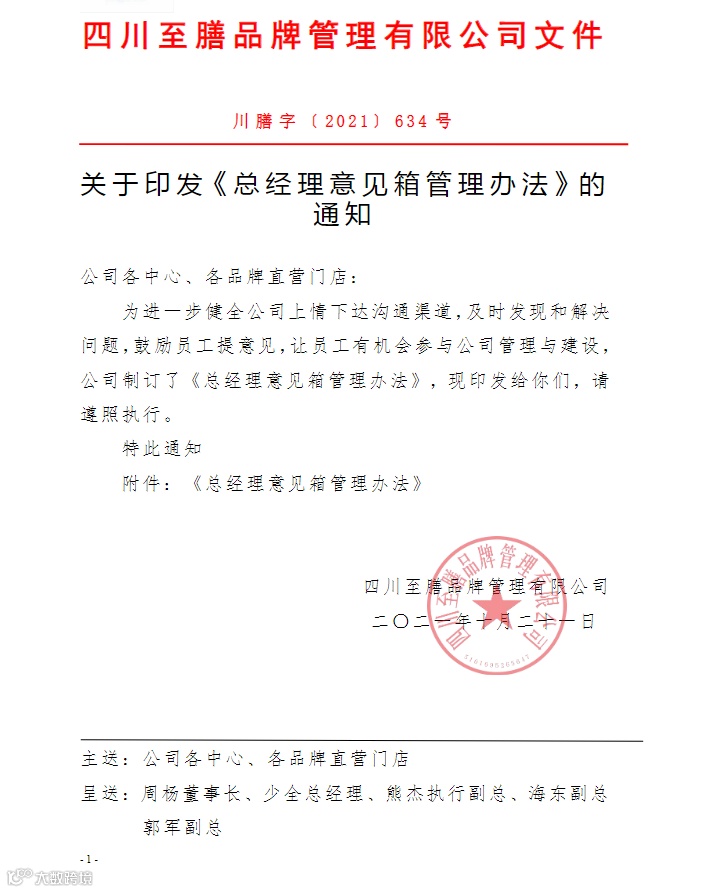 本周,至膳品牌督导、人事、运营中心共同到贤合庄、谭鸭血品牌直营店安装总经理意见箱。以鼓励员工积极参与门店管理,深入基层,解决一线员工日常工作中遇到的问题。据悉,其他各品牌直营店也将陆续完成安装。