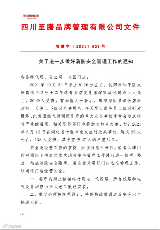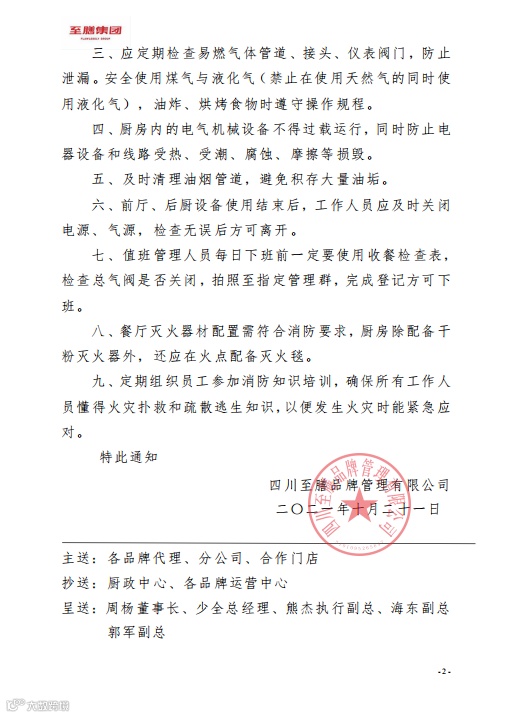近日,至膳品牌发布《关于进一步做好消防安全工作的通知》,要求全国各品牌门店对照内容进行逐一的自检、梳理、整改。以确保各门店的消防安全符合规范,常态化的开展安全管理工作,做到安全经营,防患于未然。