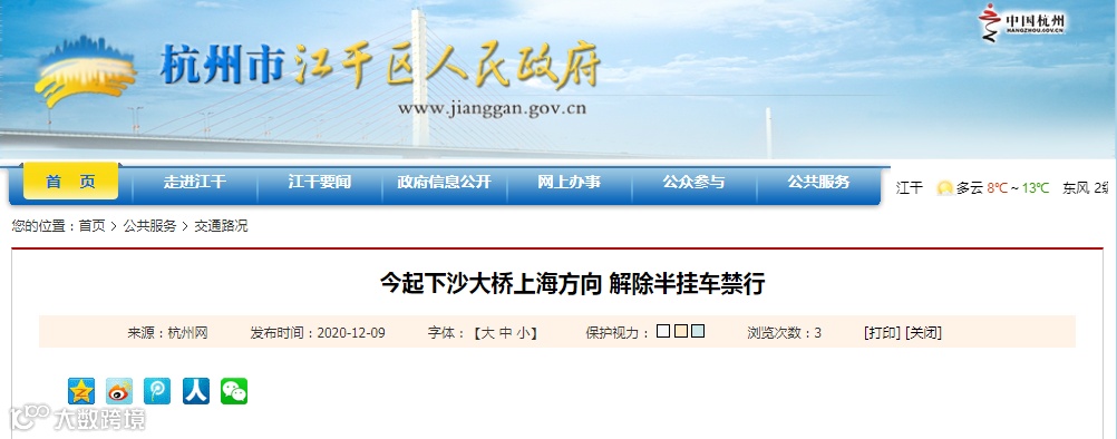 从12月9日9时起,G2504杭州绕城高速公路下沙大桥上海方向(南往北)半挂车禁行的交通管制措施解除。
