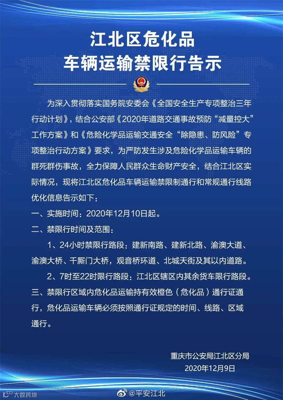 重庆江北区危化品车辆运输禁限行告示