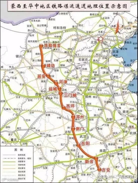 蒙西至华中地区通道主要煤源矿区:——蒙西鄂尔多斯:塔然高勒、高头窑、纳林希里、上海庙、呼吉尔特、纳林河矿区。——陕北榆林:榆神矿区三期、榆横矿区北区、榆横矿区南区;韩城矿区。——宁夏东部矿区;——山西省南部:中煤王家岭煤矿,乡宁矿区。