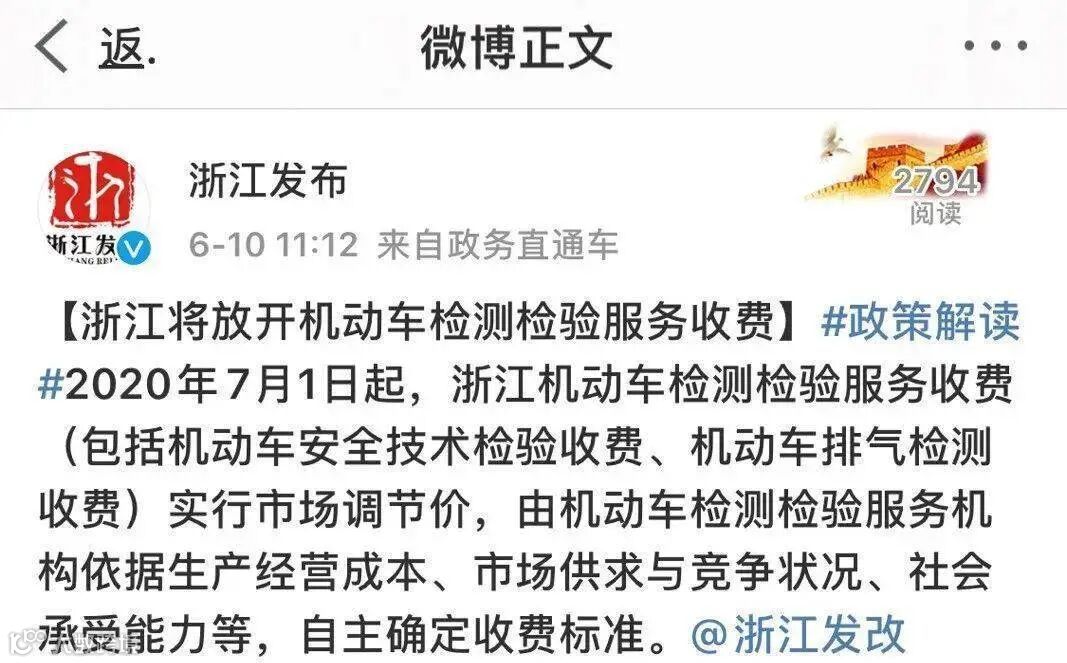 6月10日,浙江发布微博发布消息称:7月1日起,浙江机动车检测、检验服务收费由机动车检测检验机构自主确定收费标准。
