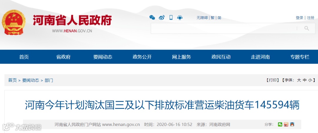 ● 日前,河南省交通运输厅、生态环境厅等五部门联合印发《河南省淘汰国三及以下排放标准营运柴油货车工作实施方案 》(以下简称《实施方案》)。