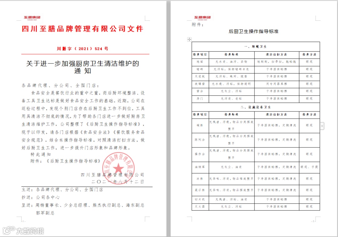 8月12日,至膳品牌针对旗下全品牌印发了《后厨卫生操作指导标准》,旨在帮助全国门店进一步做好厨房卫生清洁维护工作。