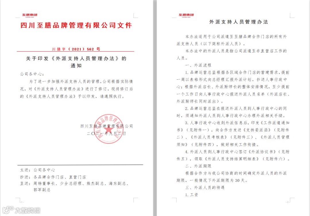 9月2日,至膳品牌对现行《外派支持人员管理办法》进行了修订,进一步加强了对外派支持人员的管理。