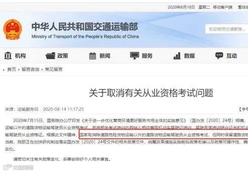 7月21日,国务院办公厅发文提出,要推动取消除道路危险货物运输以外的道路货物运输驾驶员从业资格考试。8月14日,交通运输部运输服务司在官网上正式回复了该问题,明确表示:相关考试将会被取消,但从业资格证将会同时保留!