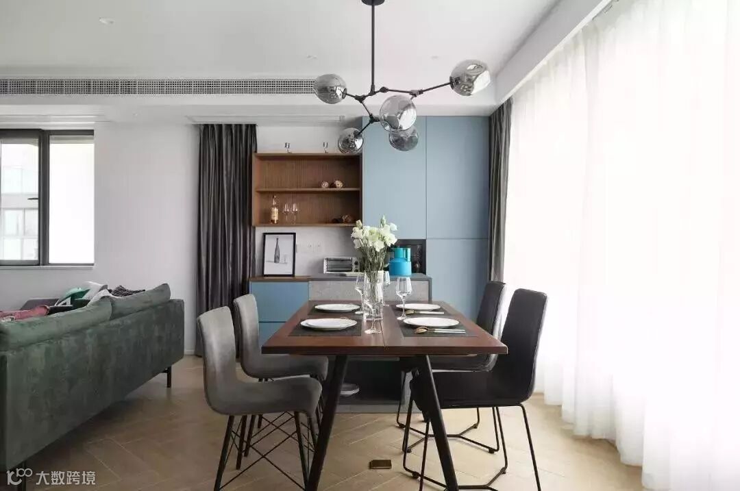 如果你家是长方形客厅,而开发商又没有确切的隔开客餐厅的区域,那么就可以将沙发背靠餐桌进行摆放。