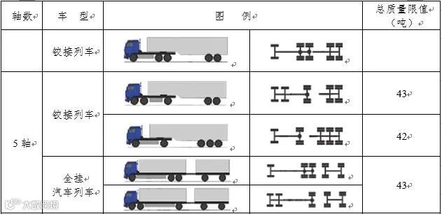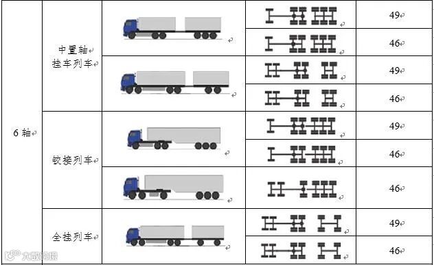 2.除驱动轴外,图例中的二轴组、三轴组以及半挂车和全挂车,每减少两个轮胎,其总质量限值减少3吨。