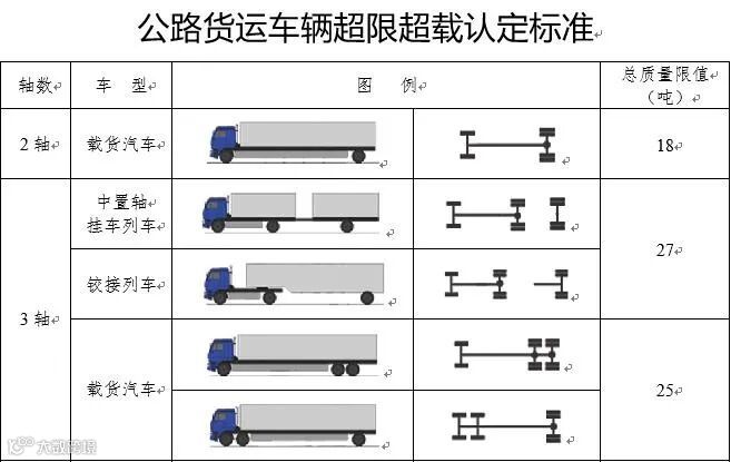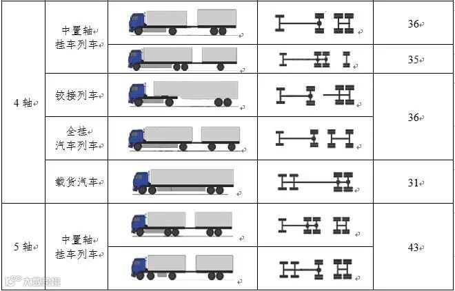 4.驱动轴为每轴每侧双轮胎且装备空气悬架时,3轴和4轴货车的总质量限值各增加1吨;驱动轴为每轴每侧双轮胎并装备空气悬架、且半挂车的两轴之间的距离d ≥1800mm的4轴铰接列车,总质量限值为37吨。
