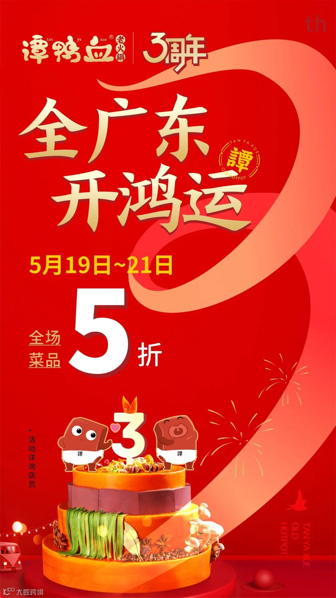 1、5月19日-21日三天5折,到店即享,全广东门店参与(折扣仅限菜品,茶位费、酒水饮料、锅底酱料、纸巾除外);