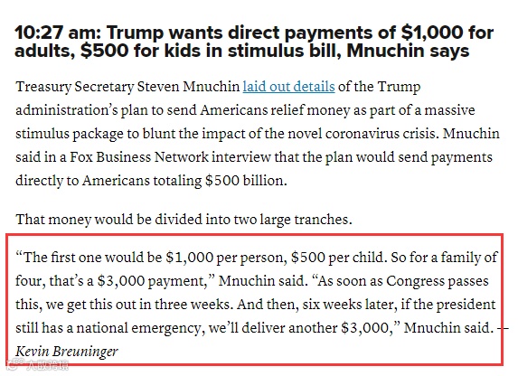 CNBC消息,方案提出,成人每人$1000,小孩每人$500,假如一个四口之家(2个成人+2个小孩),那么他们可能将受到$3000的支票。