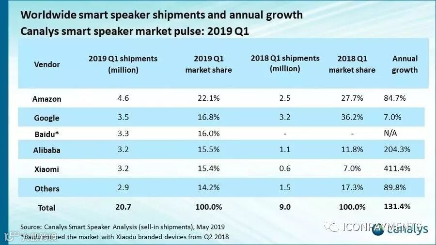 Canalys 机构数据显示,2019 年一季度,中国智能音箱销量达到 1060 万台,同比增长近 500%。这个销量数字占全球智能音箱总量的 51%,使得中国成为全球最大的智能音箱市场,而美国的份额则从 44% 下降到 24%。从数据上看,百度、阿里巴巴和小米都为市场份额作出了贡献,一季度出货量分别都在 320 万台左右,市场份额分别约占 15.5%。而排在一二名的仍然是亚马逊和 Google。