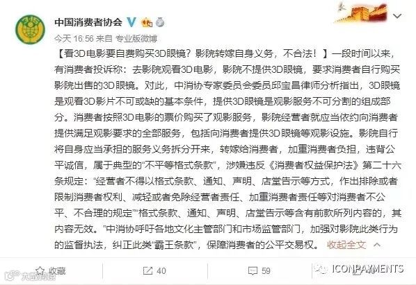 🔶中消协认为影院要求自费购买 3D 眼镜是「霸王条款」