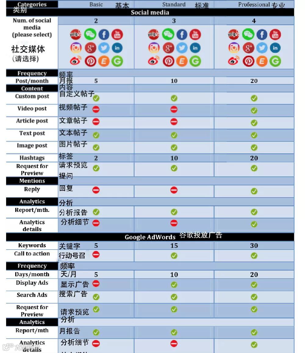 Yelp/微信/facebook/youtube/
