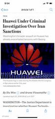 🔶华尔街日报:美国司法部调查华为是否违反伊朗制裁规定