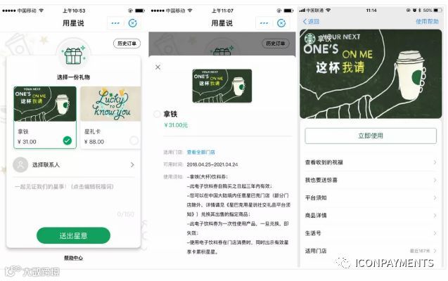 星巴克在支付宝上线了“用星说”小程序,功能定位与微信端基本一致。支付宝首页搜索“星巴克”,即可进入这款应用,目前提供31元到288元价值不等的星巴克卡券。点击卡券,可以查看适用门店、时间,以及使用须知。用户可以选择联系人,编辑祝福语,“送出心意”,即可将购买的礼物送给朋友。