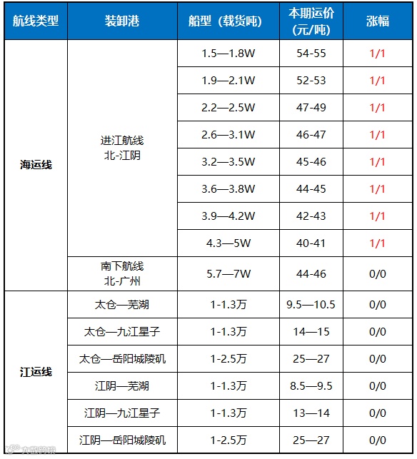 受到成本增加及需求提振,船东抬价情绪较浓,今日海运价格小幅补涨;周四江运市场继续维稳运行,受到油价上涨影响,运营成本增加,船货双方呈现僵持状态。