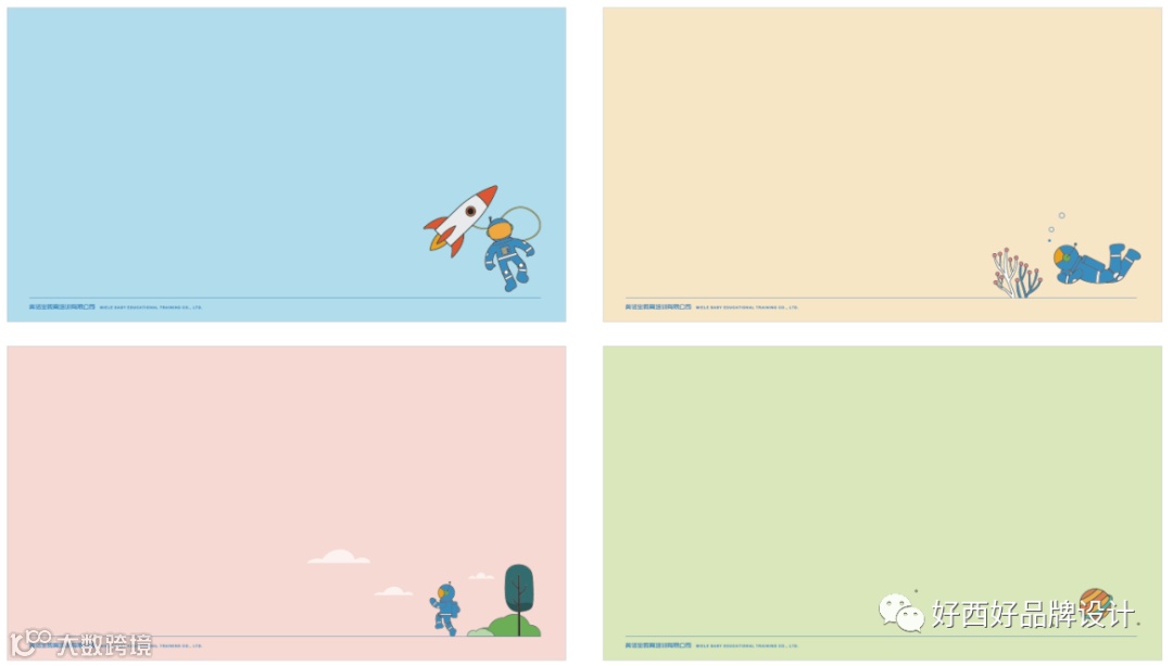 充分尊重了孩子喜欢色彩鲜艳的生理特性,插画创作中,在不脱离品牌主色调的前提下,同样采用了明快清爽的色彩,圆润柔和的笔触,呈现出了可爱活泼、童趣满满的插画作品,十分符合品牌鼓励孩子探索、求知,及早教中心对孩子的关怀、引导教育的品牌理念。