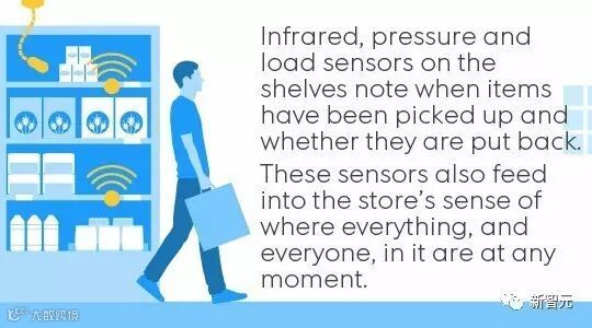货架上的红外传感器、压力感应装置(记录商品被取走),以及荷载传感器(记录商品被放回)会记录下消费者取走了哪些商品以及放回了多少商品。同时,这些数据会实时传输给 Amazon Go 商店的信息中枢,每位顾客都不会有延迟。