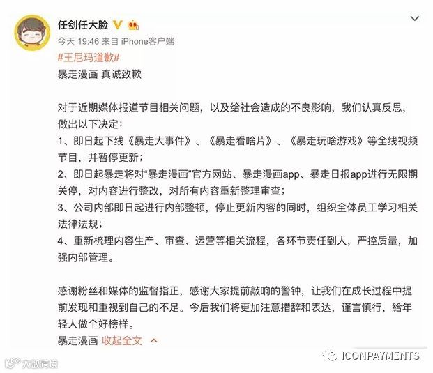 任剑称,公司内部即日起进行内部整顿,停止更新内容的同时,组织全体员工学习相关法律法规;重新梳理内容生产、审查、运营等相关流程,各环节责任到人,严控质量,加强内部管理。