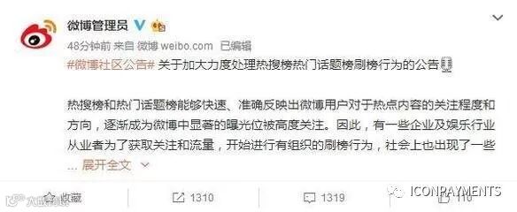 为遏制和打击刷榜行为,微博将加大对热搜榜热门话题榜刷榜行为的处理力度,并对直接受益者进行处罚。微博公布的“3月以来刷榜行为突出的热搜词和话题”名单中包括“区块链第一高价域名”等词条。微博还宣布,刷榜话题3个月之内不能再上热门话题榜和热搜榜;相关账号3个月之内不能主持话题。