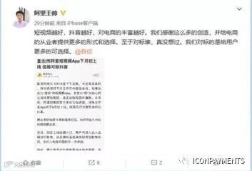 5月18日,针对淘宝将要推出对标抖音的独立短视频App一事。阿里巴巴集团市场公关委员会主席王帅在微头条上回应称:“至于对标谁,真没想过。我们对标的是给用户更多的可选择”。他还说道,短视频越好,抖音越好,对电商的丰富越好。我们感谢这么多的创造,并给电商的从业者提供更多的形式和选择。