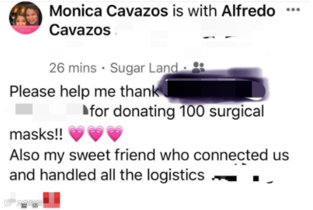 首位受捐者是来自UT Health的Monica,在她领取了100个口罩后,发布了facebook希望更多的医护工作者能受到帮助: