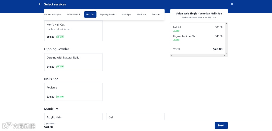 在预约首页将会完整展现您店内所提供的预约项目和服务价格,为了方便客人可以快速找到自己感兴趣的项目,ByChronos 还特意设置了快速导航功能,客人只需选择项目类别,页面就会快速定位到那项菜单,一秒钟就能帮客人找到相关服务项目。