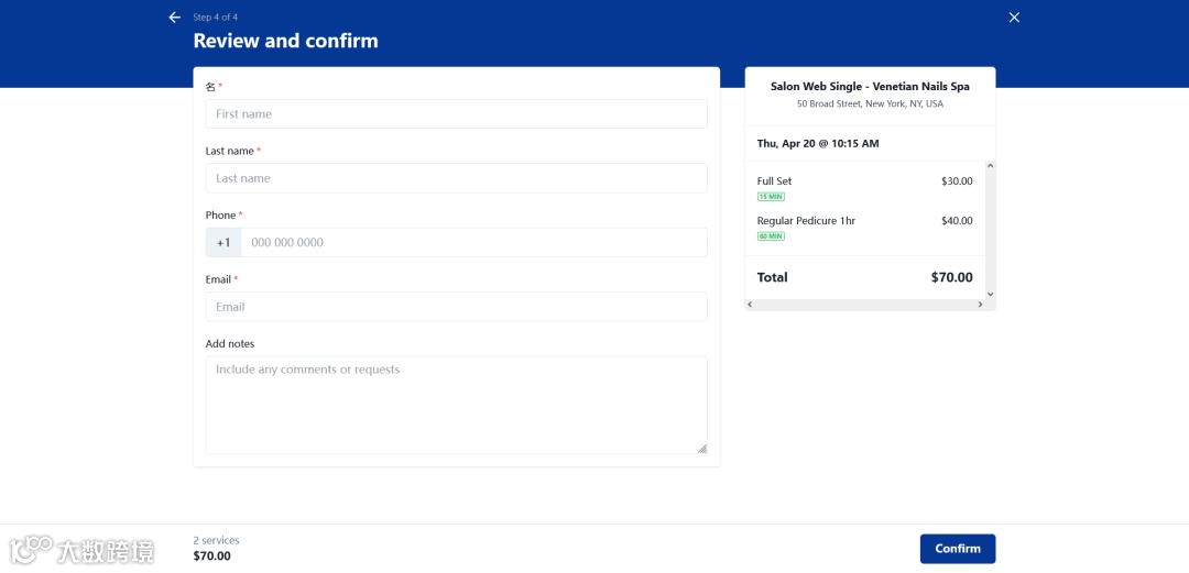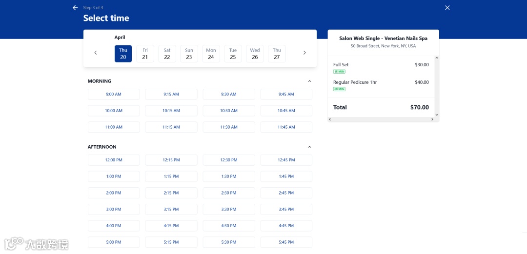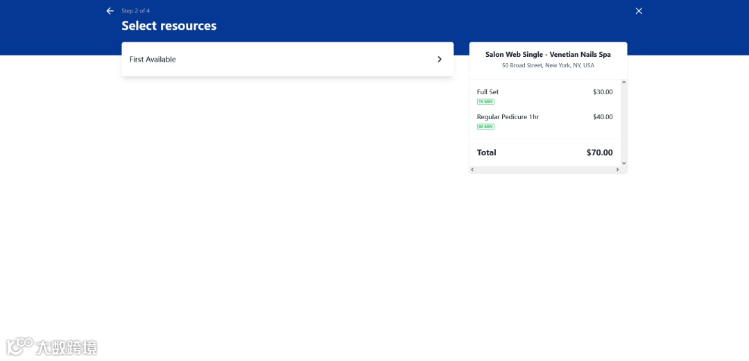 ByChronos 和 Go3booking 都采用了循序渐进式的预约引导页面,为客人提供清晰明了的预约指引。整个预约过程共有五个步骤,分别为:选择预约项目——选择服务人员——选择预约人数——选择预约时间——填写联系方式。