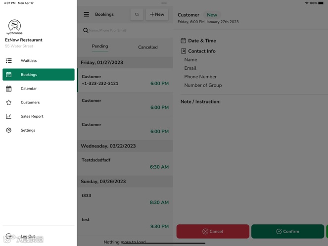 除了客人预约网站之外,Go3 还分别为餐饮类商家和其他行业商家提供专业的线上线下预约管理APP。配套APP可以实时接收预约、订座订单,并按时间顺序可视化呈现预约列表,让商家可以随时掌握店内预约动态,在平板上调节等待名单,以确保餐厅桌位或预约服务的流畅性衔接。