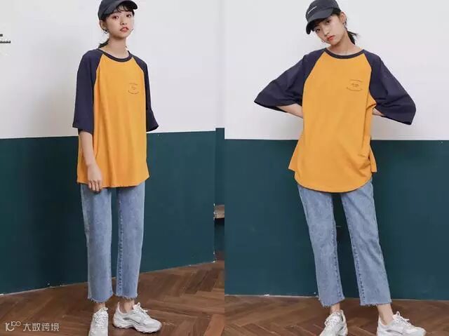 穿搭1拼色T恤+九分牛仔裤