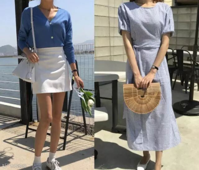 或者是直接穿上一条连衣裙,连衣裙是可以体现出女性优雅气质的时尚单品,就像图中小姐姐所穿一般,选择一条蓝色条纹连衣裙搭配一双白色小皮鞋,这样的穿搭也很能体现夏季的美感,外出的时候带上一顶遮阳帽,或是带上一把太阳伞,这样就不会被晒伤晒黑,还能保住你的气质和美感。