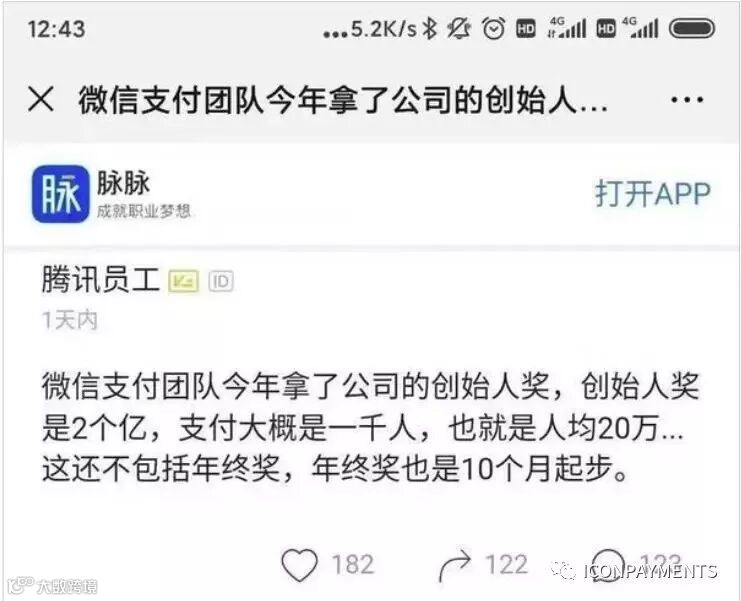 🔶传微信支付团队获 2 亿奖金:人均 20 万
