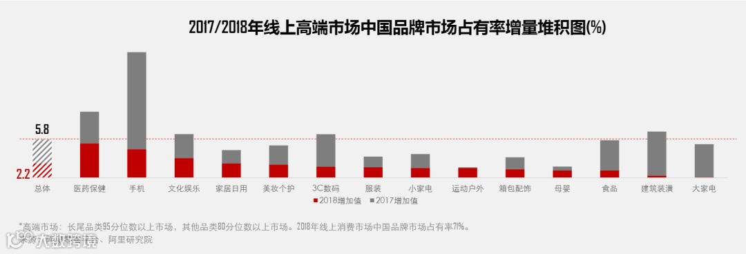 线上高端市场中国品牌市场占有率同比上年提升2.2个百分点,达到29.1%。数据显示,医药保健、手机、文化娱乐、3C数码、建筑装潢五大行业线上高端市场增速领跑总体增量。值得关注的是,2018年医药保健、家居日用、运动户外、母婴四个行业在中国品牌高端市场占有率比上年实现加速提升。(数据:阿里研究院2019)